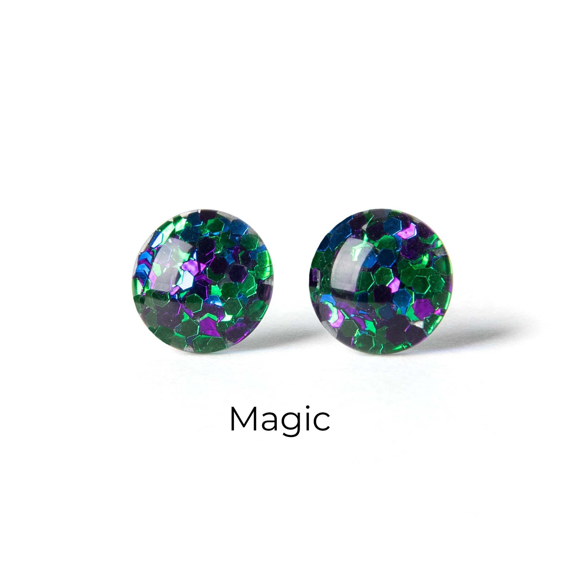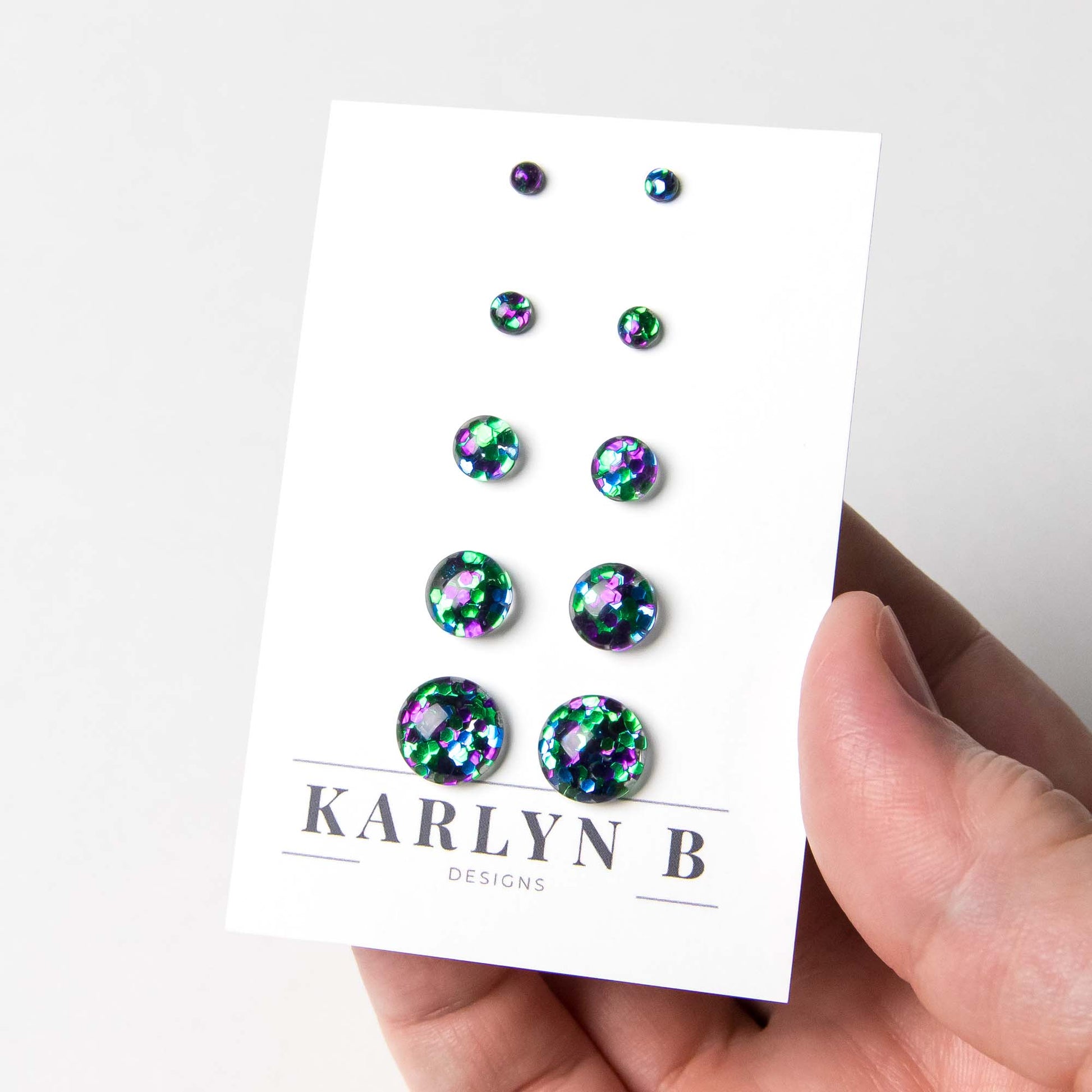 Color Dot Stud Earrings in Blue, Green, and Purple Glitter